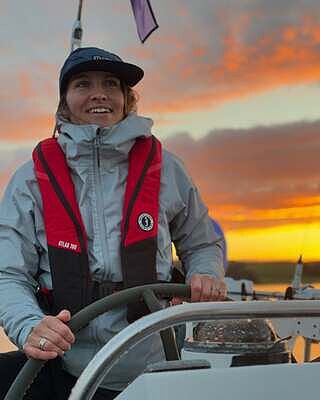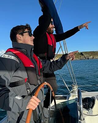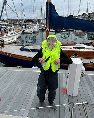 Early morning like usual, lovely calm but cold morning! We said goodbye to Firebird who rafted up next to us last night with the other half of the crew onboard. We set off and practiced Man Over Board drills and how to Wing on Wing. We also put the pole for the jib out as the wind was behind us, so we set up the sails to use for acceleration. On our journey back we came across some friendly dolphins who podded alongside us for a minute. As the evening was coming to an end onboard, my mustangsurvival life jacket deployed as I accidentally caught it on a shroud line which deployed the life jacket.😅woops…