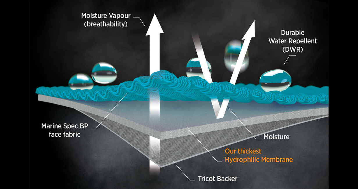 Marine Spec BP is our toughest fabric, benchmarked with Mil Spec 6.5 Gore-Tex for abrasion, saltwater, and UV resistance. Its 70D nylon face, bi-component membrane, and PFC-free PU coating ensure top breathability, waterproofing, and windproofing—perfect for coastal sailing, racing, and cruising.