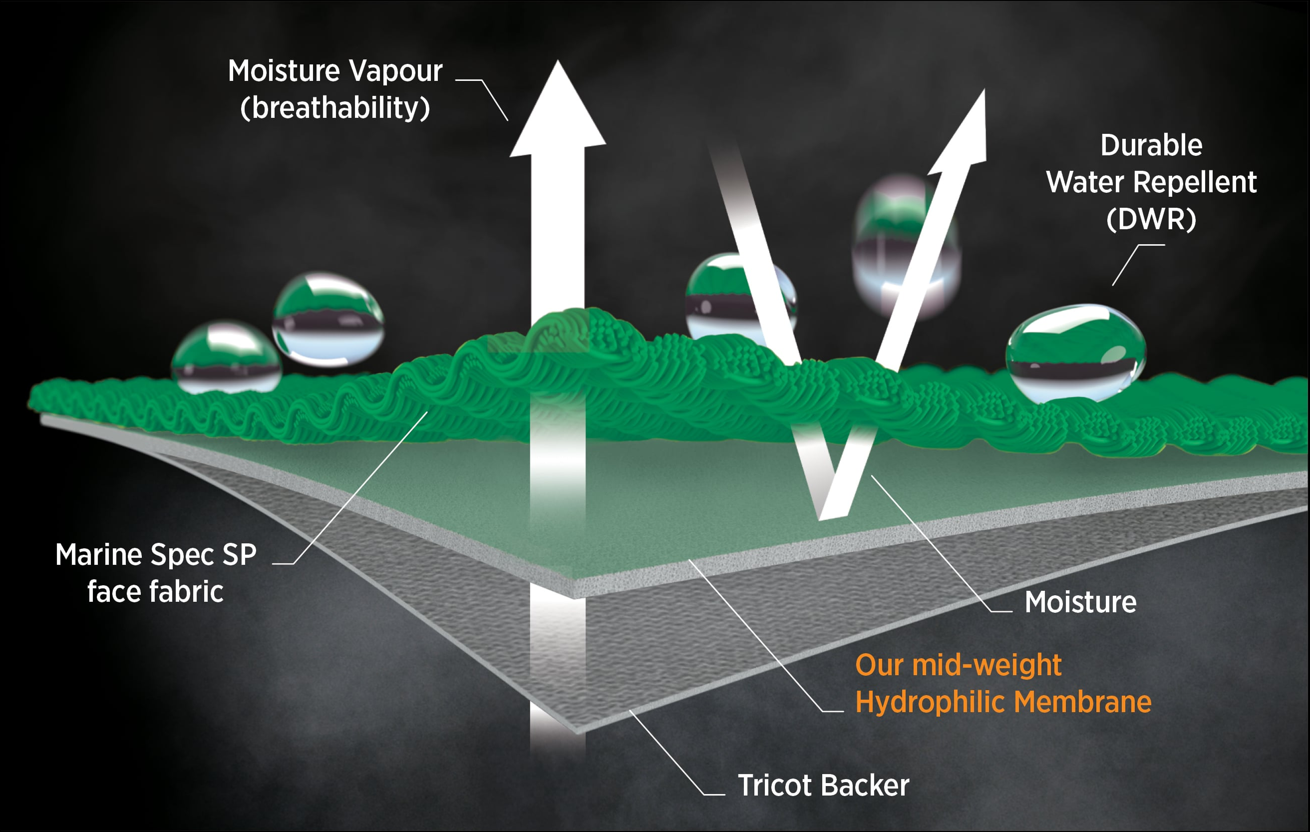 We developed our Marine Spec SP 3-layer fabric with one clear intention: to out perform all other waterproof fabrics when exposed to saltwater and harsh marine environments.